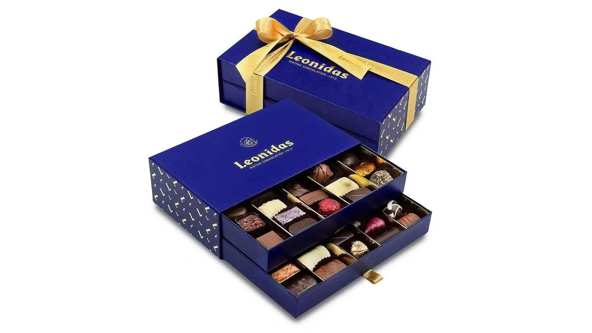 O selecție de 40 de praline asortate, prezentată în noua cutie Leonidas Bleu Royal. Această cutie Bleu Royal adaugă o notă de eleganță cadoului pe care îl veți oferi. Pralinele Leonidas sunt aranjate cu delicatețe în cele două sertare și pot fi servite cu ușurință.