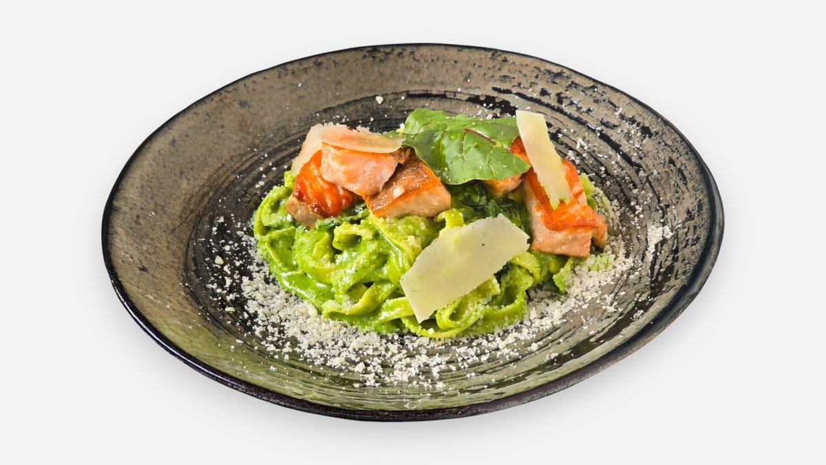 Tagliatelle cu pesto de spanac și somon