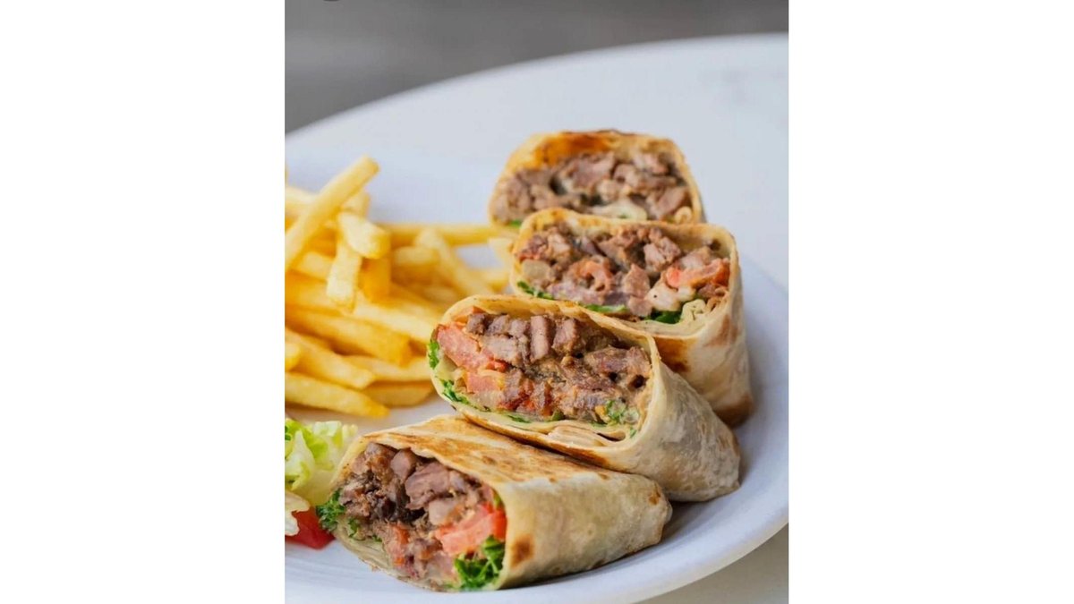 Lipie, brânză Cheddar, strips de pui, sos Sarmouszak, roșii, salată verde, castraveți murați + cartofi pai+Ketchup 650 g