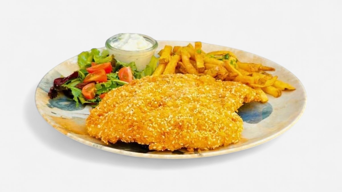 *snitel piept de pui, seminte de susan, cartofi rupti the original, sos tzatziki. 350g