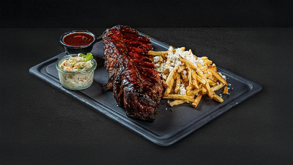 *5 coaste fragede de pork, glazura BBQ picanta, cartofi cu telemea, sos BBQ, salata coleslaw. 280g