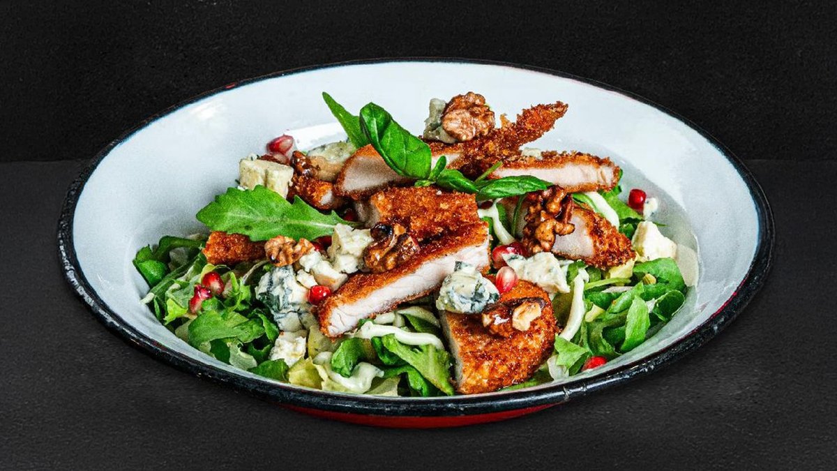salata, *snitel de curcan, gorgonzola, maioneza, nuci, rodie. 300g
