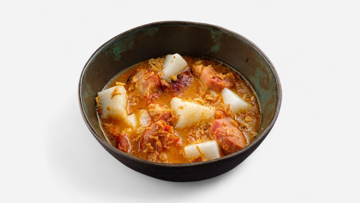 Ciolan de porc afumat, turmeric, ghimbir, ghimbir aromat, galangal, iarbă de lămâie, alune candle-nut, tamarind, usturoi, ardei iute. Servit cu lontong (orez fiert sub presiune). Opțional, se drege cu limes și ardei iute tocat (dacă vrei să fie iute ca-n Indonezia) 550gr.