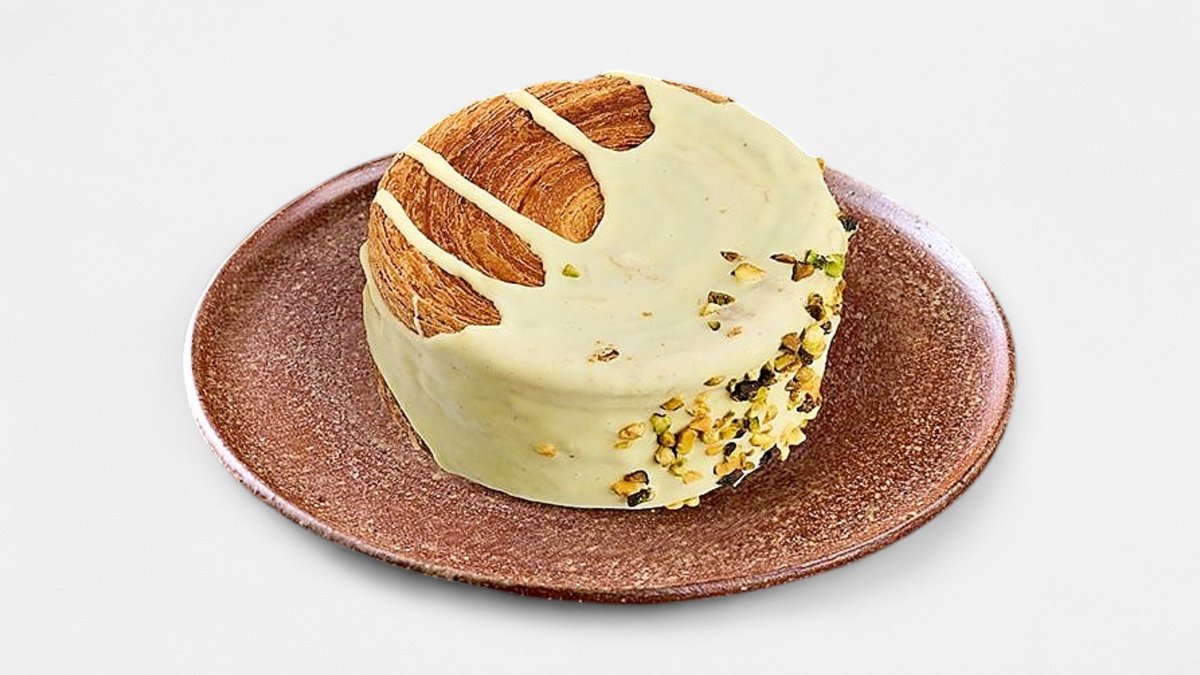 Un desert modern cu aluat croissant caramelizat, umplut cu o cremă fină de vanilie și fistic, acoperit cu glazură de ciocolată albă. Texturi crocante și cremoase se îmbină perfect într-un gust intens, elegant și irezistibil. (270.4 kcal / 1131.4 kJ | 5.56 g proteine | 13.69 g grăsimi | 31.24 g glucide) 160 g