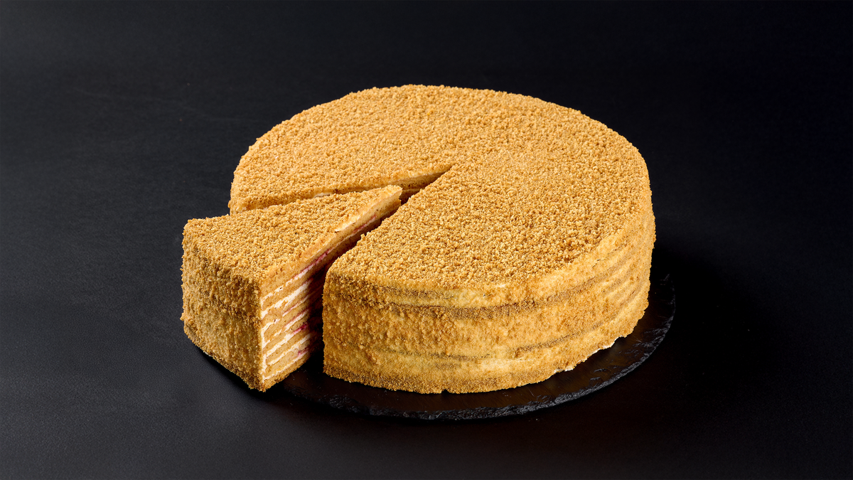 Prăjitură fină cu foi fragede de miere, umplute cu cremă catifelată din smântână și brânză, îmbogățită cu nuci crocante și note dulci de caramel și miere. Un desert clasic, cu gust autentic, perfect echilibrat între texturi și aromă. (342.49 kcal / 1432.98 kJ | 5.51 g proteine | 23.8 g grăsimi | 27.11 g glucide) 120 g
