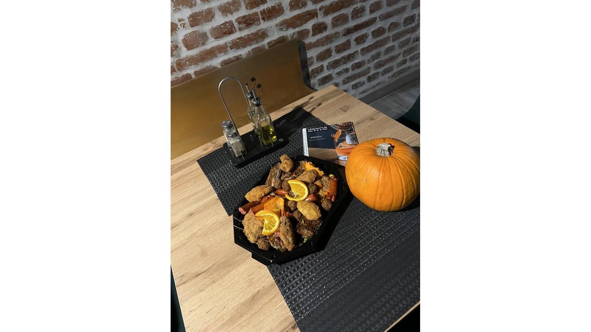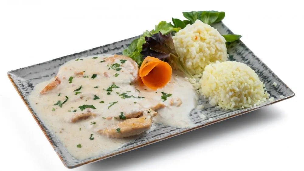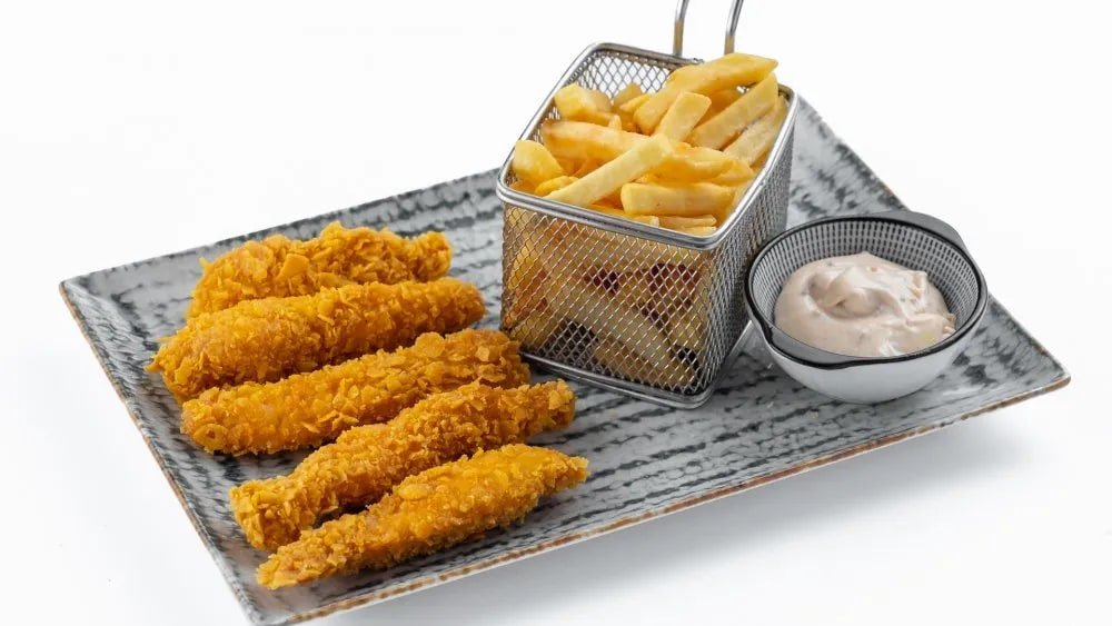 Crispy de pui, cartofi prăjiți, sos de usturoi