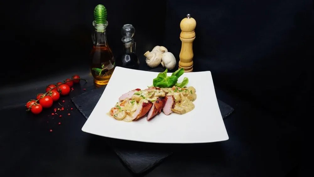 Mușchiuleț de porc în mantie de prosciutto cu sos de hribi