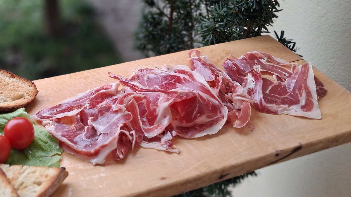 85 gr sunca crud uscata de mangalita ,de Spania servita cu paine prajita aromatizata cu usturoi si rosii cherry