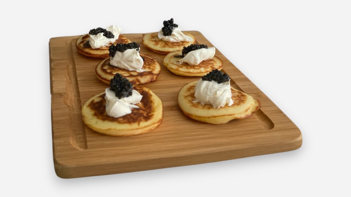 50 gr de caviar de calitate superioara servit cu crema de smantana pufoasa Blinis sunt clatite sarate