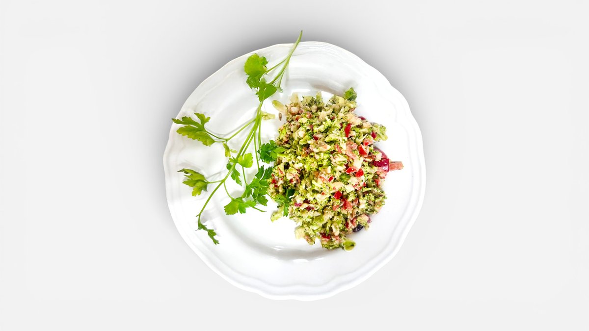 broccoli, ardei rosu gras, seminte, dressing de mustar