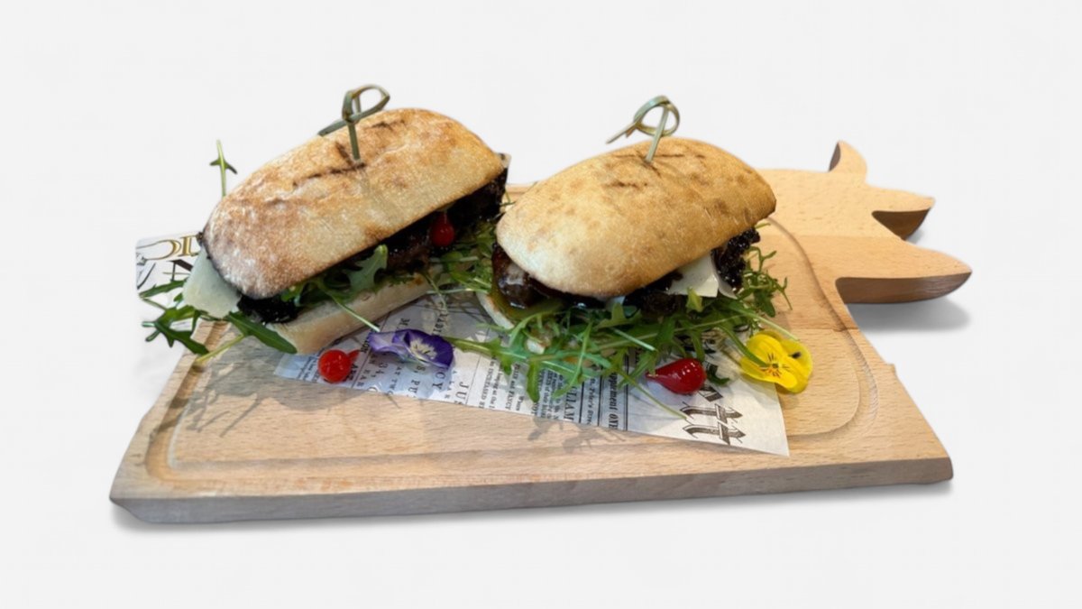 Burger din vită Black Angus, mix de salata, castraveti murati, rosie, dulceata de ceapa rosie si cartofi prajiti. 550g