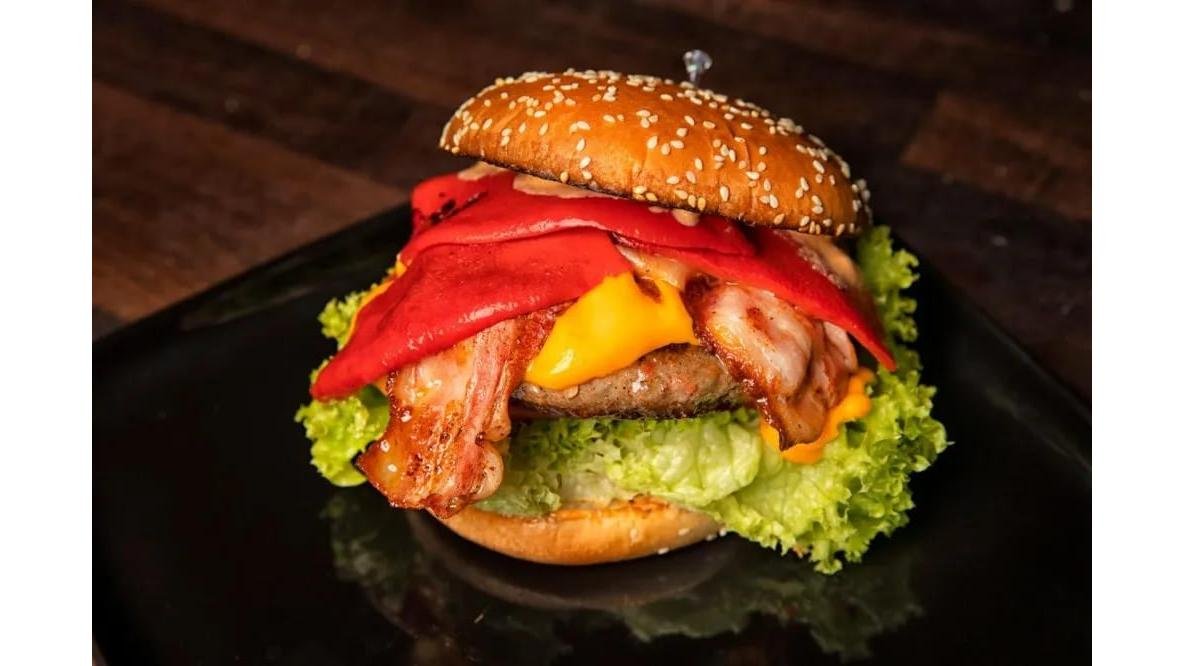 Chiflă, carne porc, bacon, salată verde, bacon, sos, ceapă roșie, roșii, castraveți murați 450 g