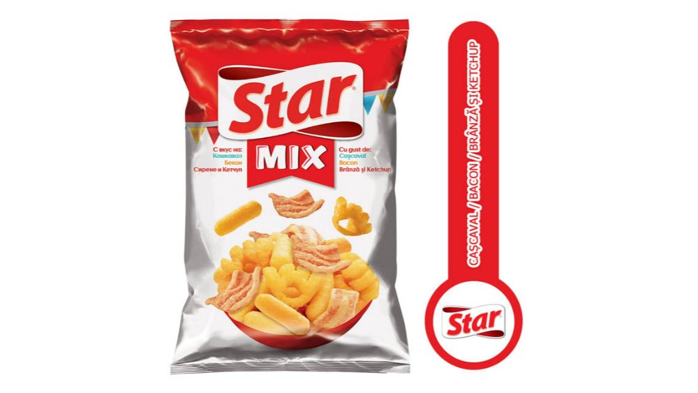 Snacks Star mix rosu cu aroma de cascaval, bacon, branza si ketchup, 90 g