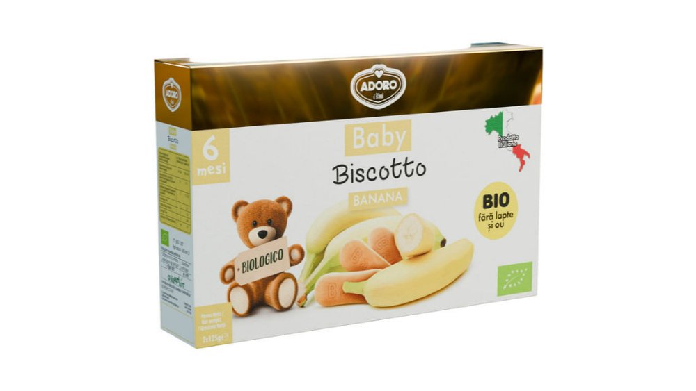 Biscuiti bio cu banane si cereale Adoro, de la 6 luni, 2 x 125 g