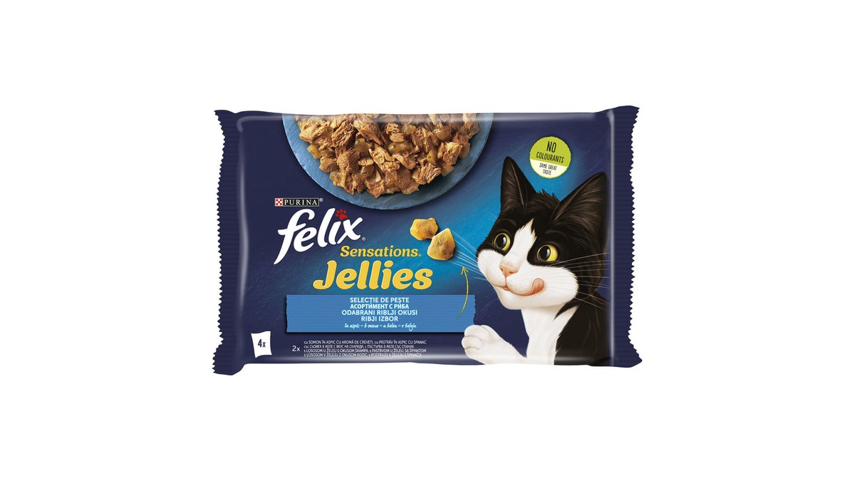 Hrana umeda pentru pisici Purina Felix Sensations, creveti, pastrav si spanac in aspic, 4 x 85 g