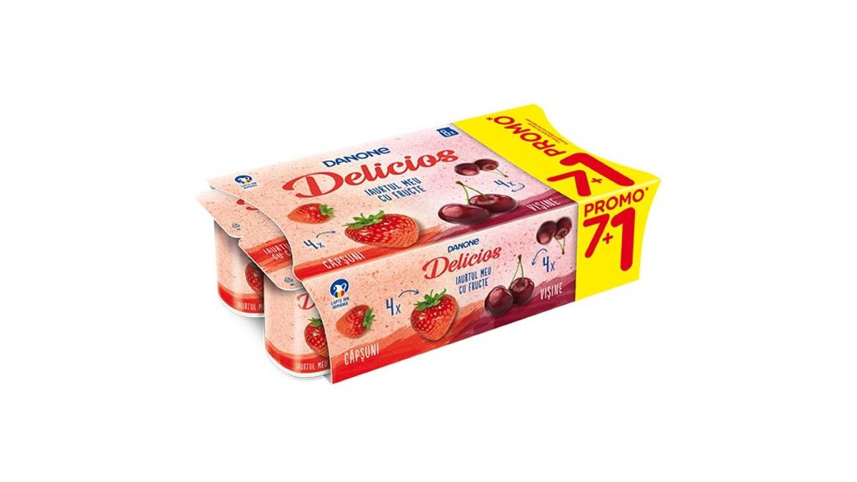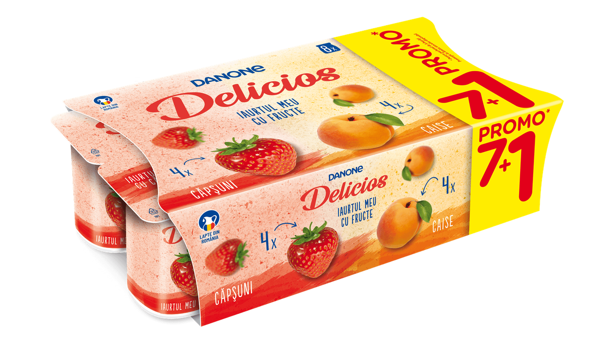 Iaurt cu capsuni si caise Danone Delicios, (7+1) x 125 g