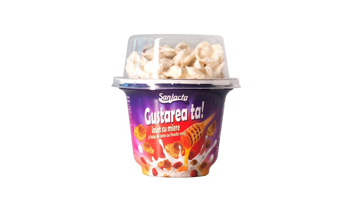 Iaurt cu miere, fructe rosii si fulgi de orez Sanlacta, 168 g