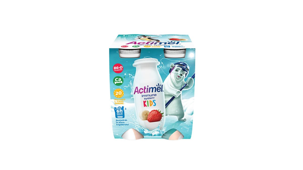 Iaurt de baut Actimel Actikids, cu aroma de capsuni si banane, 4 x 100 g