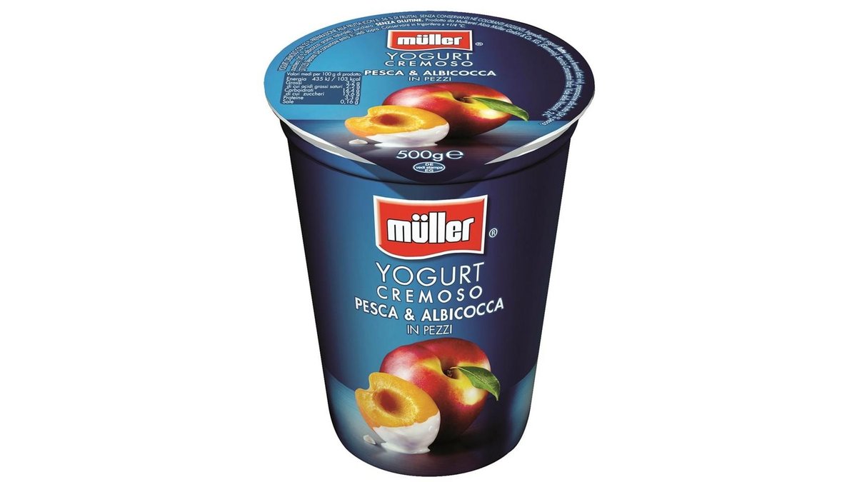 Muller Pezzi di frutta Iaurt cu bucati de piersici si caise 500g