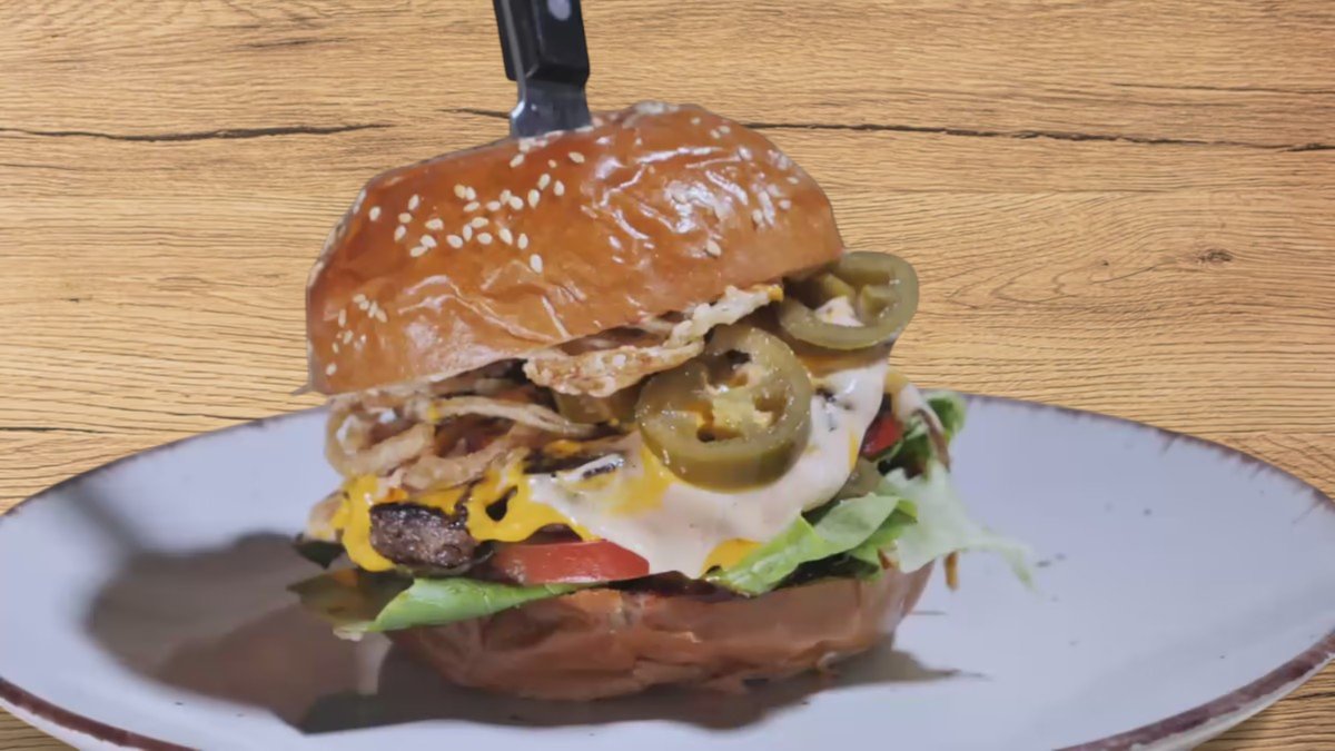 Chiflă burger, carne de vită, roșii, ceapă crocantă, salată iceberg, castraveți murați, ardei jalapeno, ketchup, sirachia, cheddar/400 g