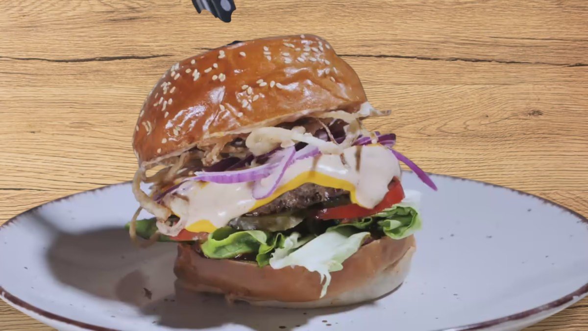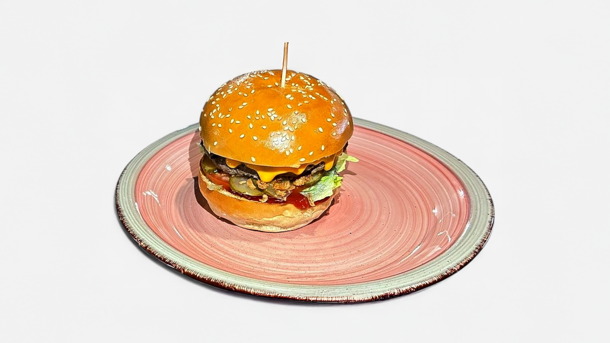 Chiflă burger, carne de vită, roșii, ceapă caramelizată, ceapă crocantă, salată iceberg, castraveți murați, ketchup, cheddar /400 g