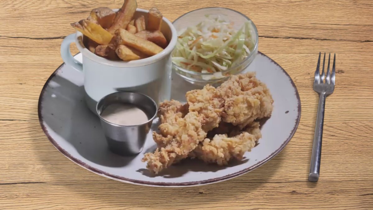 Meniu șnițel piept de pui cu cartofi pai
