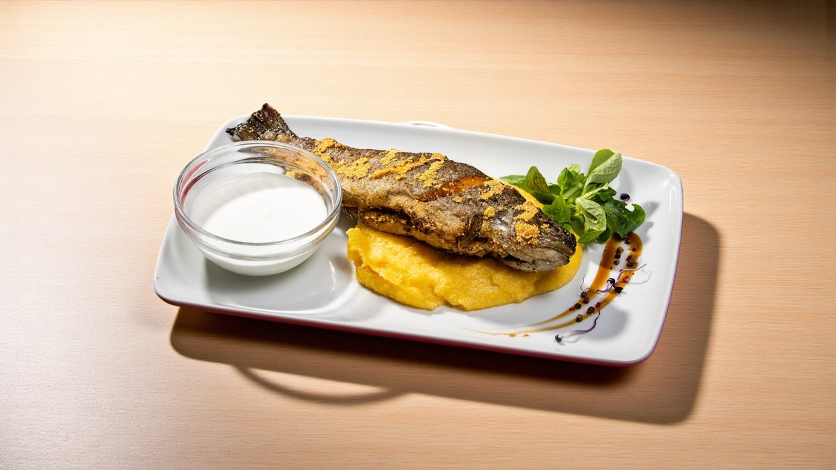 Păstrăv în crustă de mălai, mămăligă, mujdei de usturoi