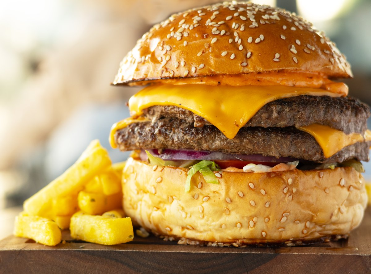 Двойная котлета из говядины, двойной сыр чеддер, соус рокфеллер, айсберг, красный лук, томат, маринованный огурец, картофель фри с орегано, кетчуп, медово-горчичный соус