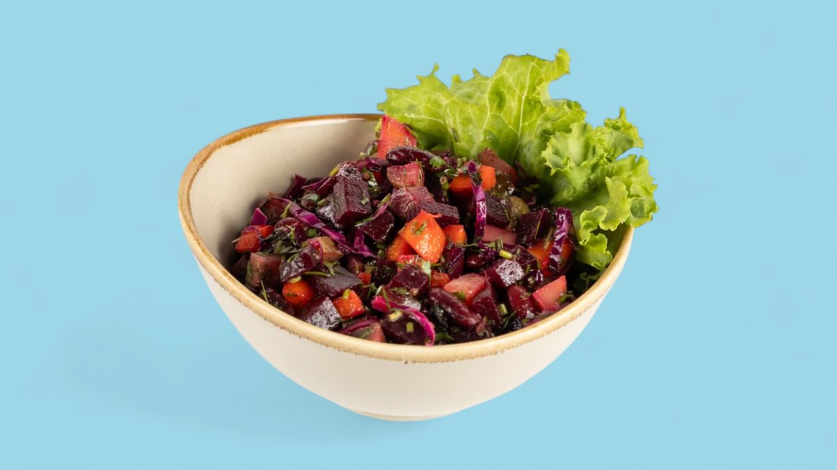 Çuğundur, kök, kartof, qırmızı kələm, qırmızı lobya, turşu xiyar, zeytun yağı, duz, istiot, göyərti — 180 kkal