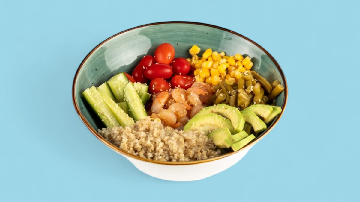 50qr krevetka, yaşıl lobya, qarğıdalı, çeri pomidor, xiyar, kinoa, avokado, aysberq, küncüt — 370 kkal