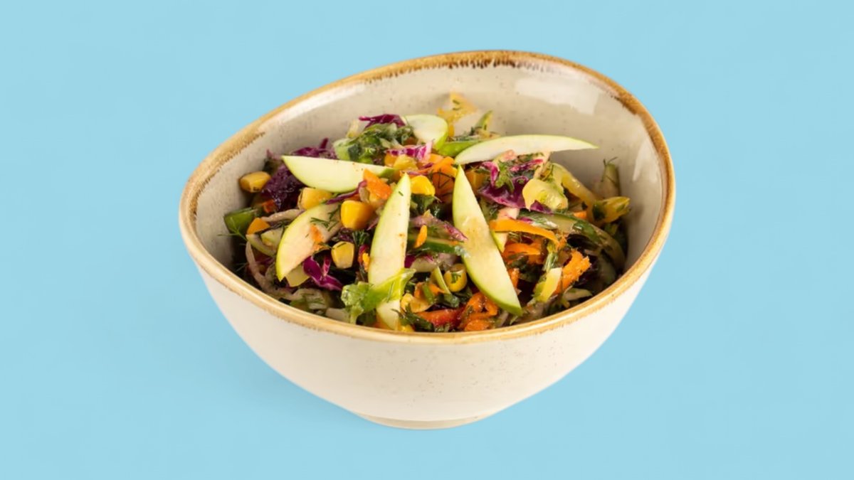 Alma, kök, aysberq, qarğıdalı, qırmızı kələm, rəngli bibər, xiyar, duz, istiot, nanə, zeytun yağı, limon suyu — 180kkal