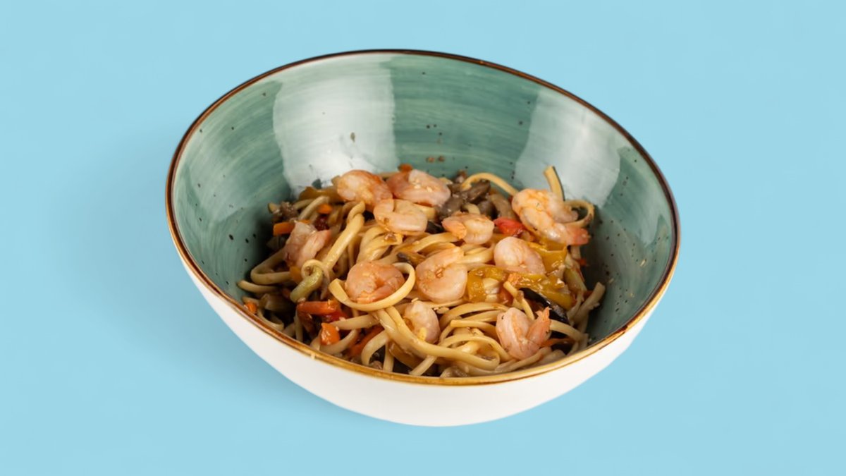 120qr krevetka, kabak, badımcan, kök, rəngli bibər, noodle, soya sousu, küncüt, duz, istiot — 370 kkal