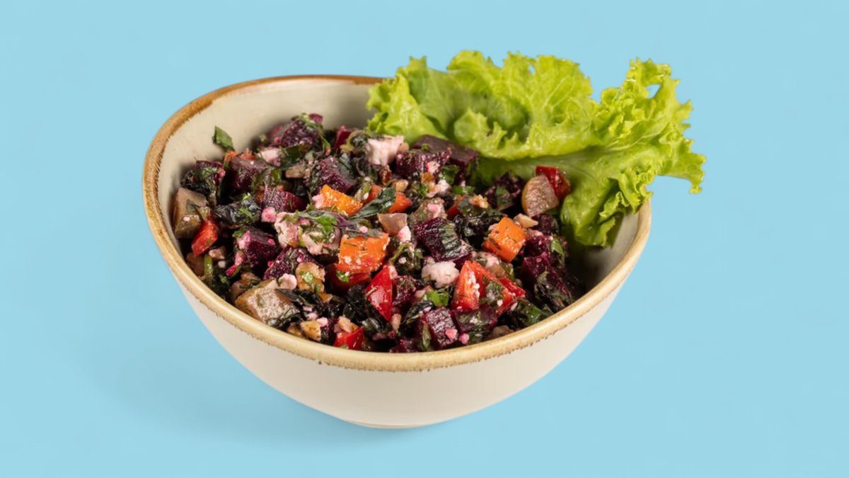 Çuğundur, kök, turşu xiyar, qoz, ağ pendir, reyhan, nanə, zeytun yağı, limon suyu, duz, istiot — 230 kkal