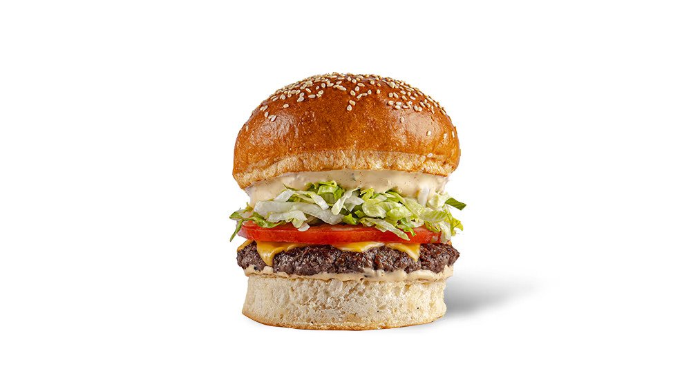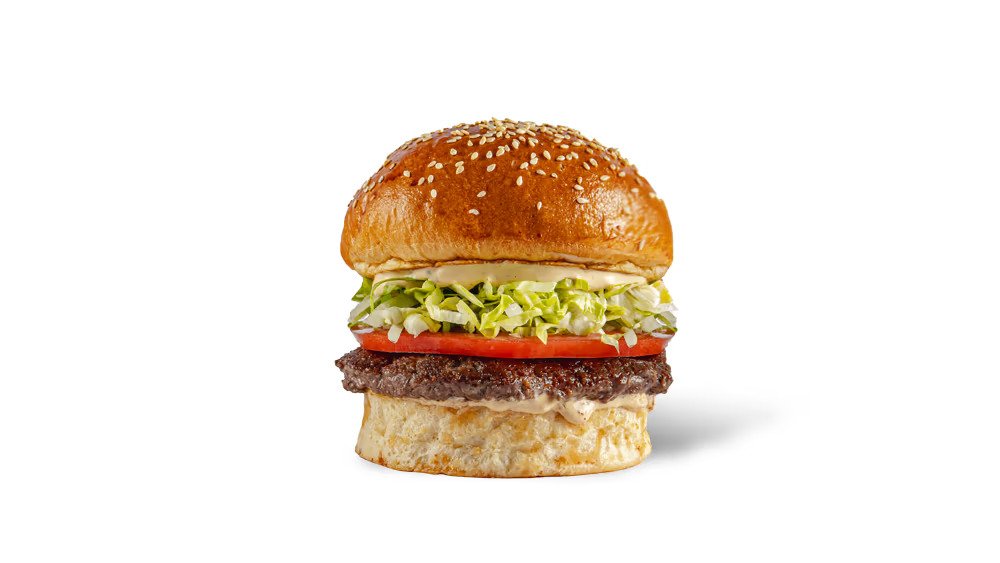 Ət(AzProtein), pomidor, kahı, pendir, karamelizə edilmiş soğan və göbələk, BBQ sousu Fri kartofu ilə birlikdə satılır