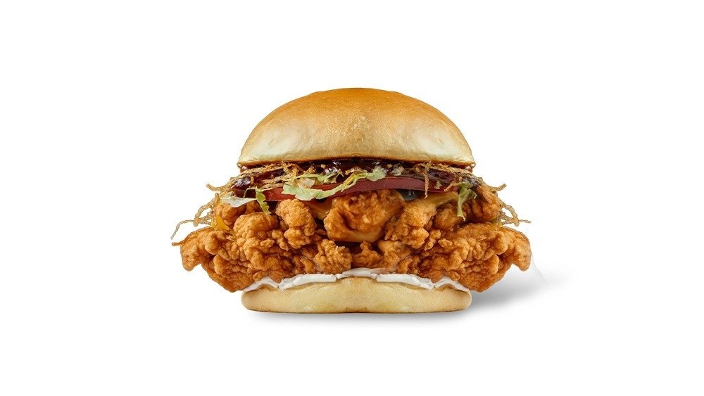 Qızardılmış toyuq, Çedar pendiri, kahı, turşu, Fryday sirri sousu Fri kartofu ilə birlikdə satılır