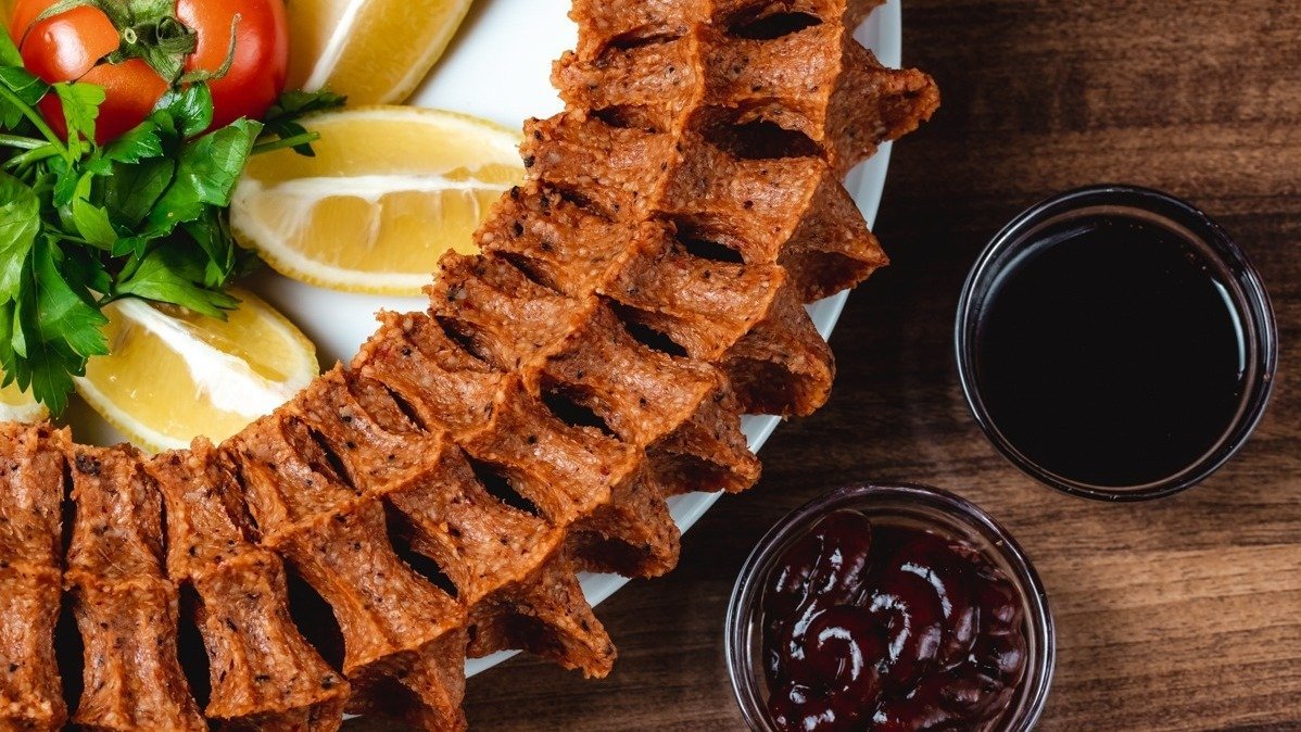 200 qr. çiy köftə, 2 əd. lavaş, 2 əd. sous, kahı, cəfəri, limon, turşu xiyar