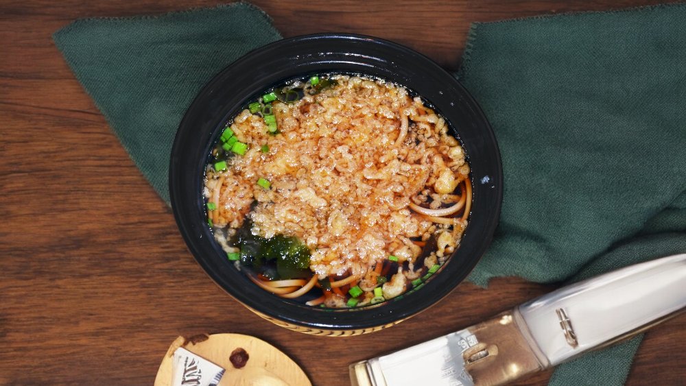 Rice noodles with seaweed, spring onion and tanuki
