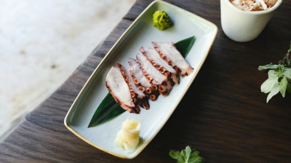 Blanched octopus with crispy cucumber, seaweed and crab sticks with mild vinegar sauce