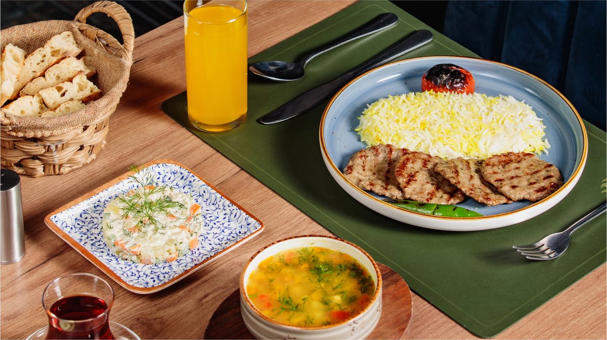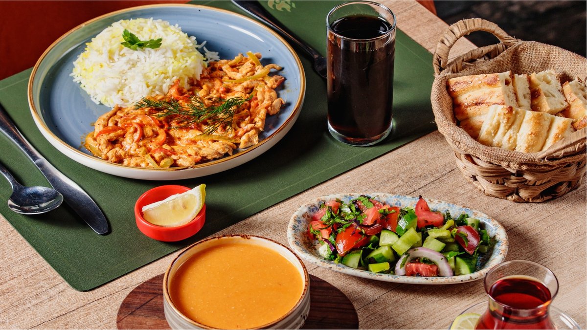 Toyuq əti, turşu xiyar, kartof fri, "Boranı" özəl sousu