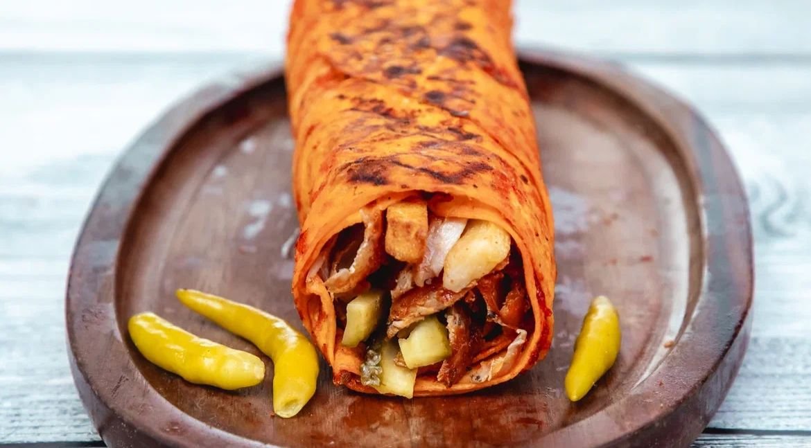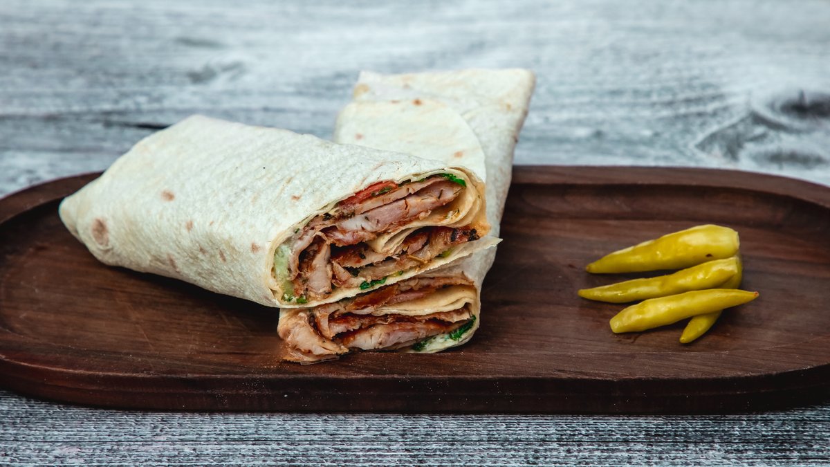 Özəl sous ile bişmiş lavaş, toyuq əti, kartof fri, turşu xiyar, pomidor , mayonez, cəfəri