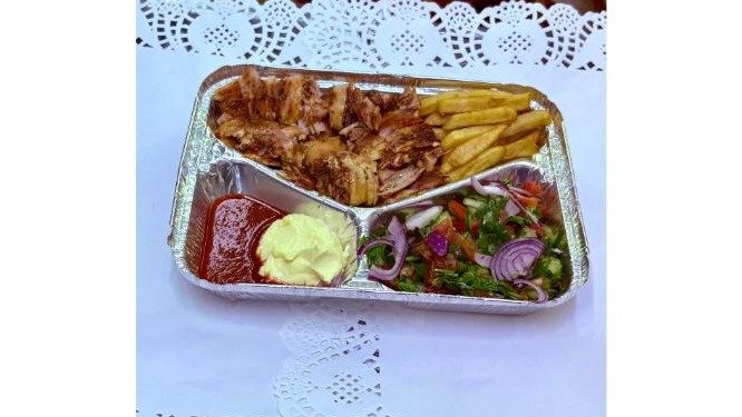toyuq eti,şaurma souzu, turşu xiyar, kartof fri
