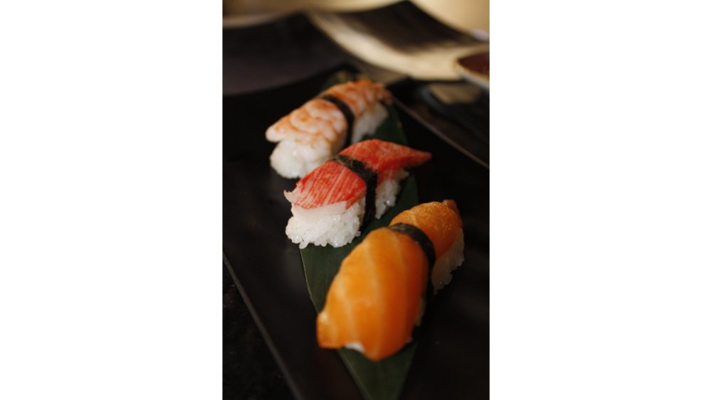Suşi düyüsü, qızılbalıq (1 əd.), krevet (1 əd.), krab çubuğu (1 əd.)