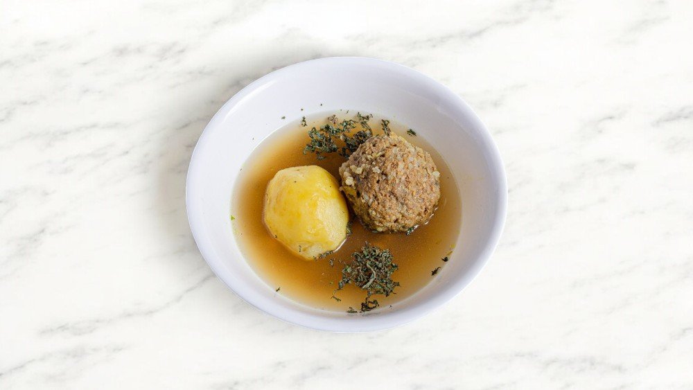 Dana ətindən küftə, kartof, bulyon, ədviyyatlar