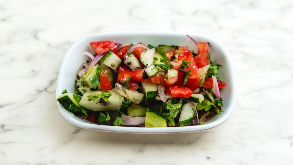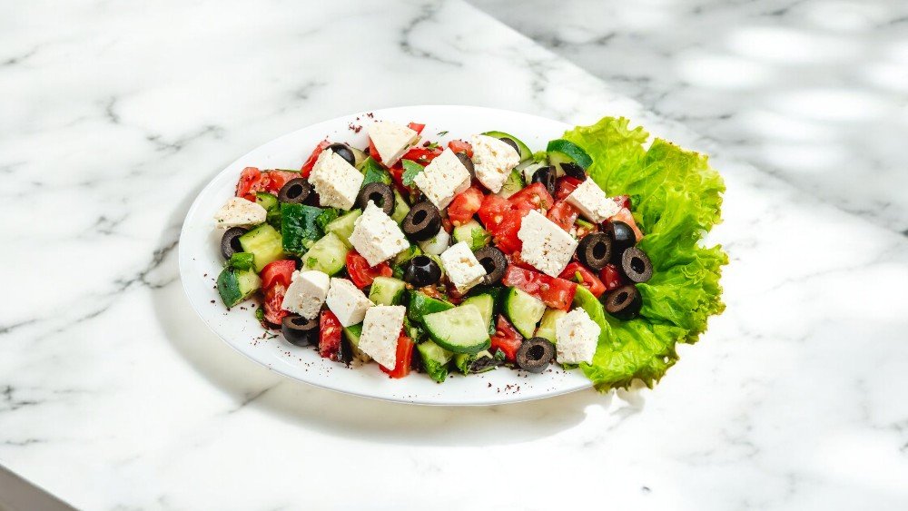 Xiyar, pomidor, bolqar bibəri, qırmızı soğan, zeytun, turp, feta pendiri, kahı, aysberq, qarışıq göyərti, tərəvəz sousu, zeytun yağı