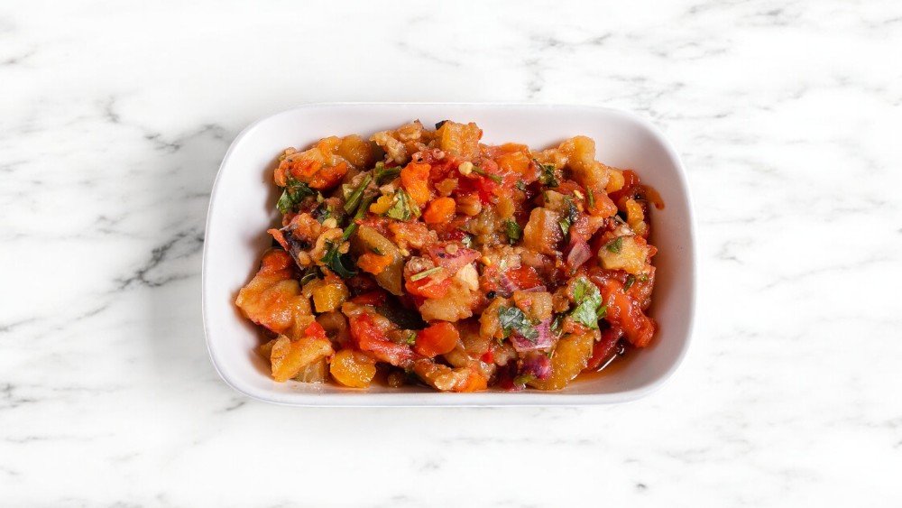 Badımcan, pomidor, sarımsaq, zeytun yağı, bibər