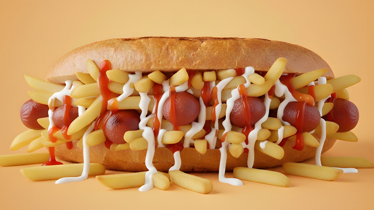 Özəl soslu dönər çörəyi arasında, özəl baharatlı kartof fri, sosis