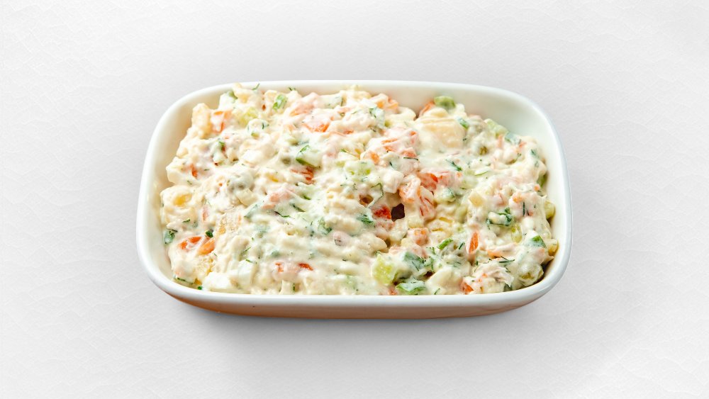 Kartof, yerkökü, yaşıl noxud, toyuq, mayonez