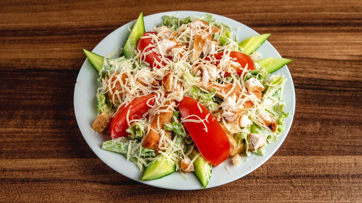 Toyuq filesi, aysberq kahısı, çerri pomidoru, pamezan pendiri, suxari, sezar sousu
