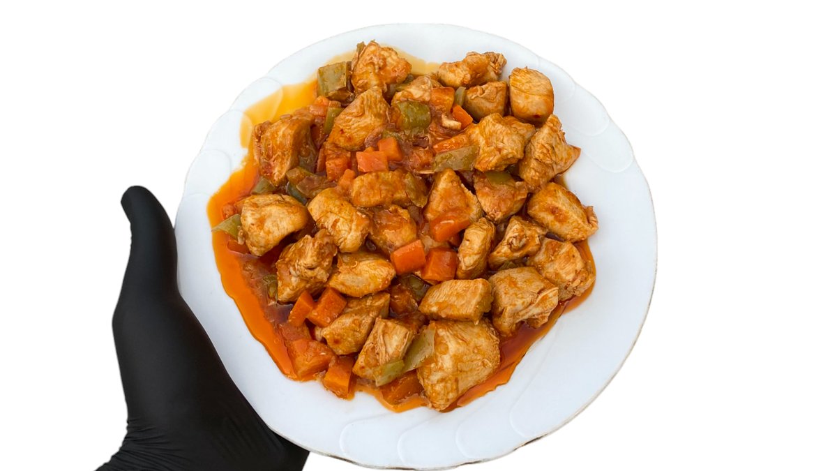 Toyuq filesi, bolqar bibəri, pomidor, xiyar