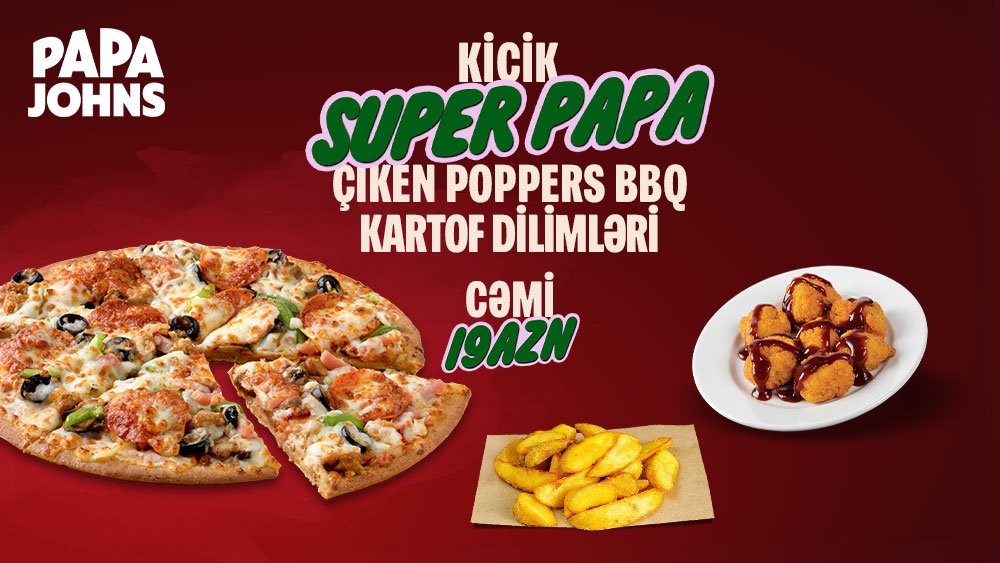 😎 Doyumlu kombo – sərfəli qiymət! Sevdiyiniz dadlar bir təklifdə birləşdi! 🍕 Kiçik Super Papa pizza 🍗 Çiken Poppers BBQ sousu ilə 🍟 Xırtıldayan kartof dilimləri 👉 Hamısı cəmi 19 AZN! Aclıq üçün ideal seçim, dostlarla paylaşmaq üçün əla fürsət! 🔥